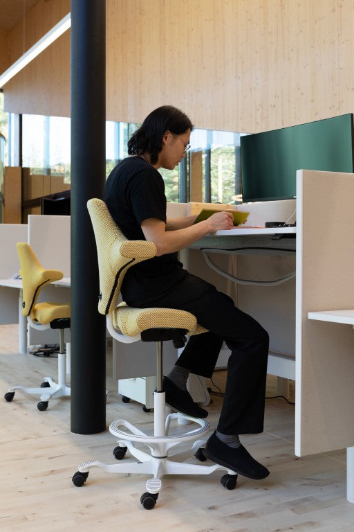 Folge dem natürlichen Rhythmus deines Körpers ohne Einschränkungen. Der HÅG Capisco macht es möglich mit einer Vielzahl an Sitzhaltungen, die sich deinem Alltag anpassen.